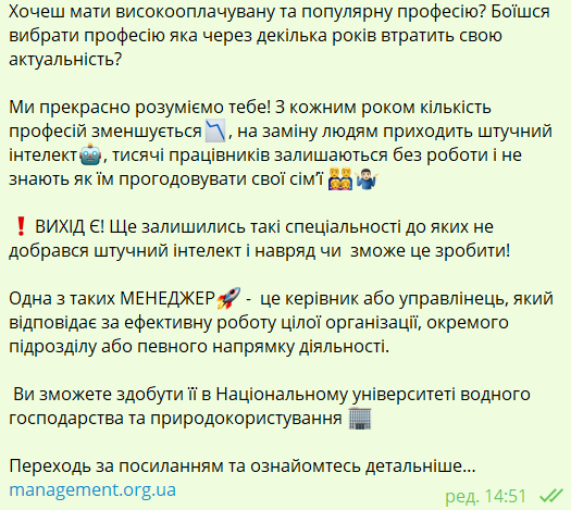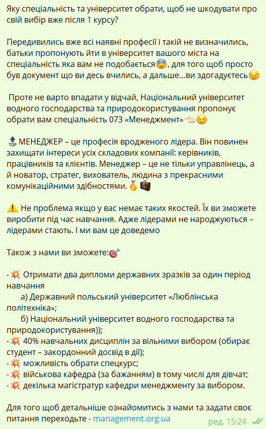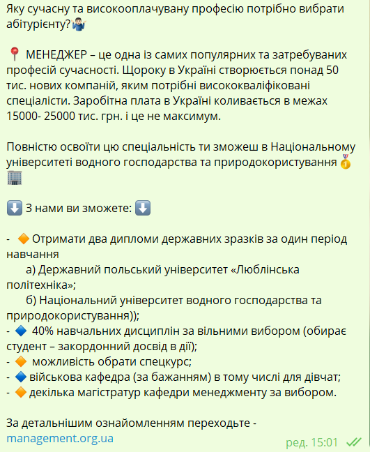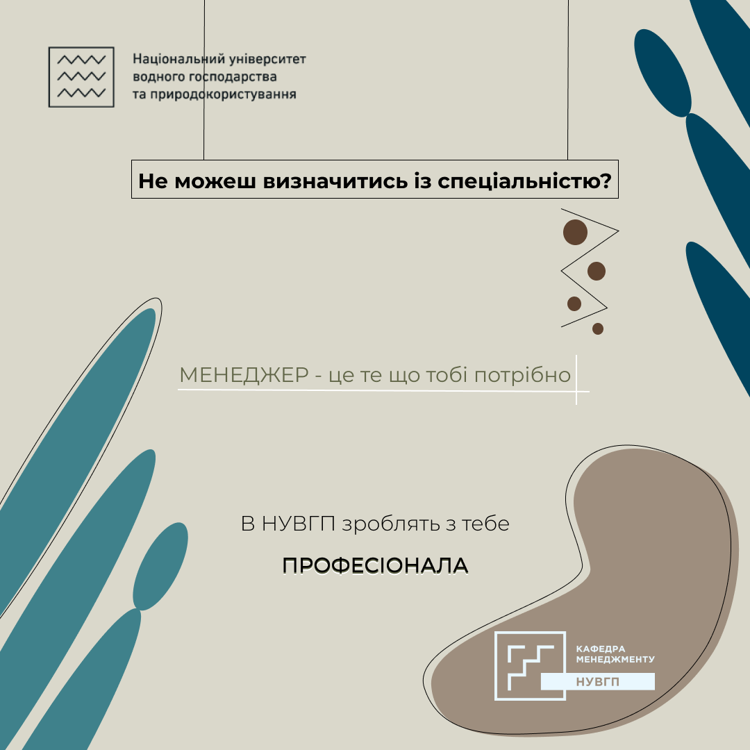 Проте не варто впадати у відчай, Національний університет водного господарства та природокористування пропонує обрати вам спеціальність 073 «Менеджмент»